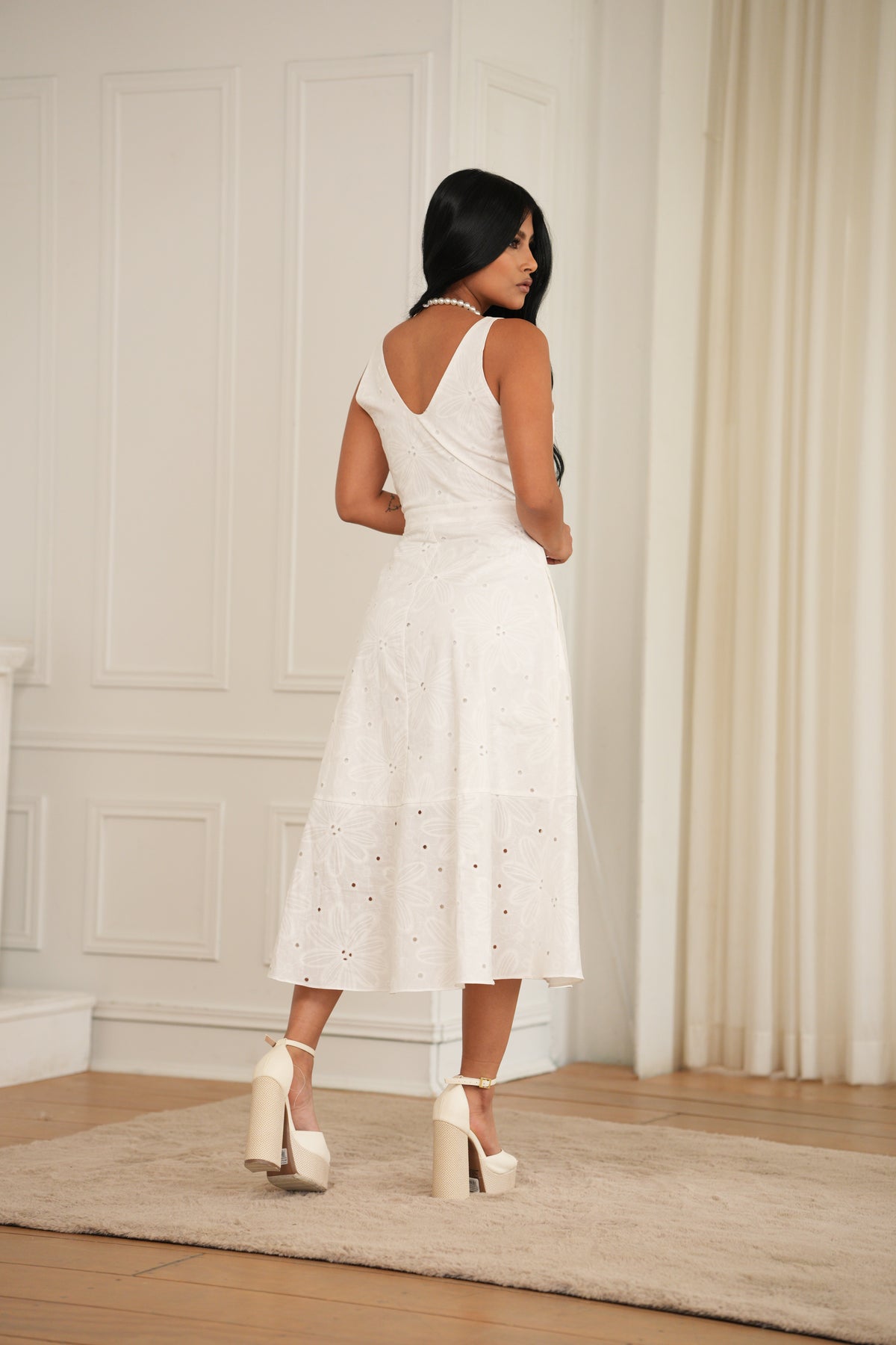 Un diseño que combina sofisticación y frescura.Este vestido largo presenta en un tono marfil sin mangas representando elegancia.